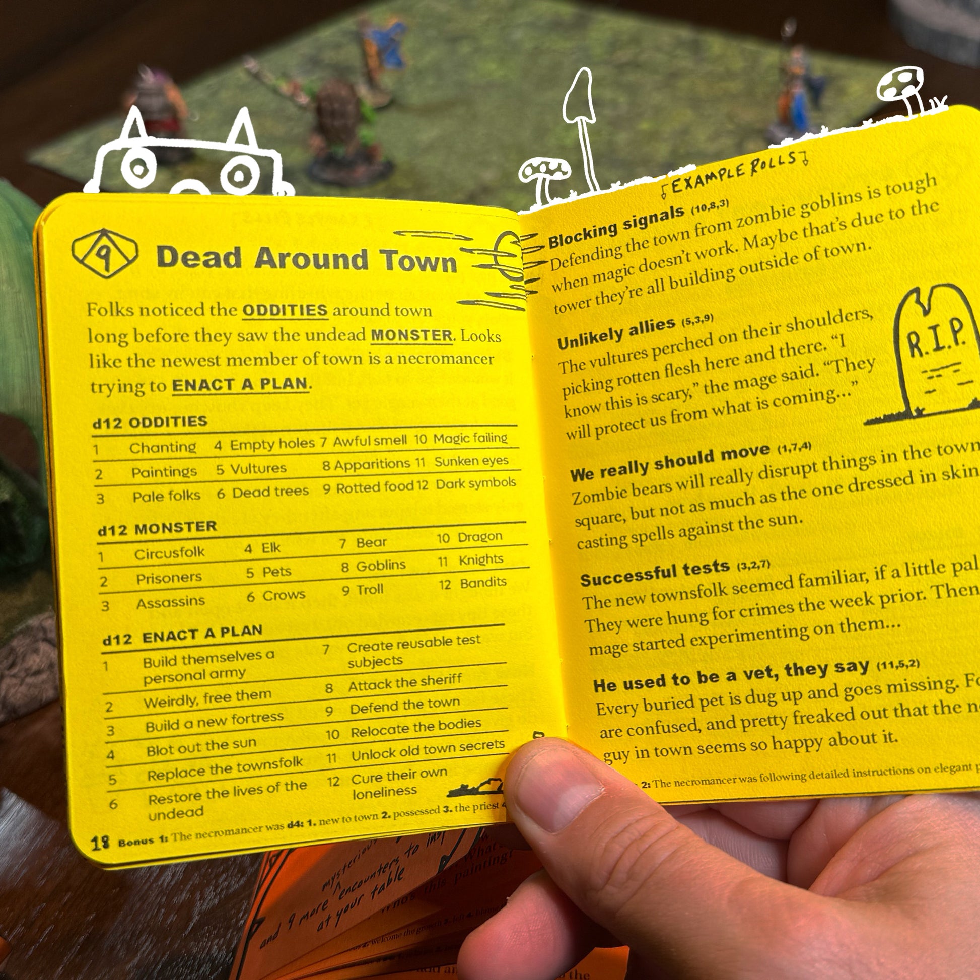 Looking for inspiration for your games? Flip through and find one that catches your attention (or roll on the page numbers!) and read the prompt. Roll on the 2 or 3 tables specific to that encounter, and you'll quickly find yourself with a unique set of new ideas.